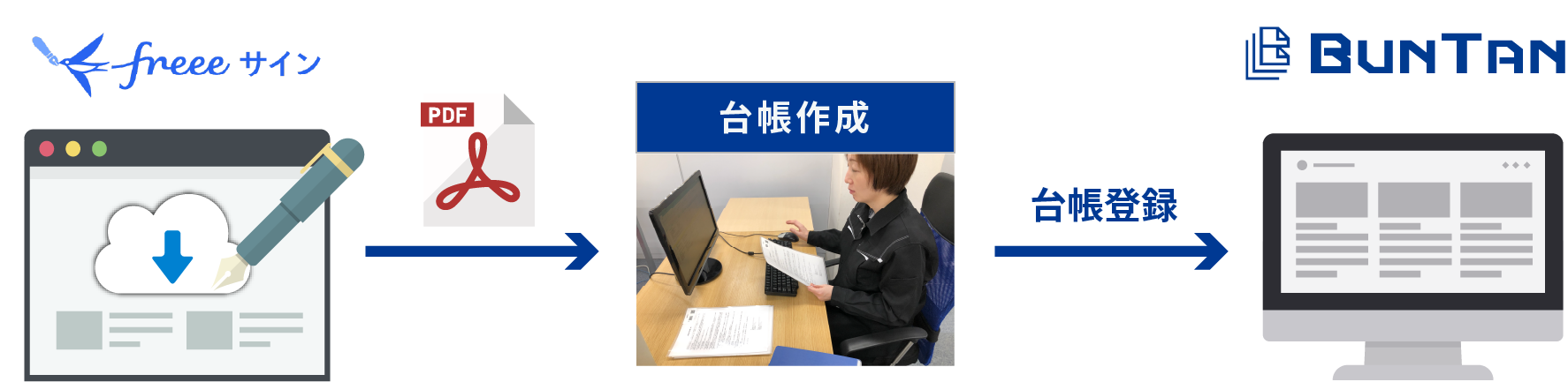 文書管理に特化したシステム「BUNTAN(ブンタン)」と電子契約サービス「freeeサイン(フリーサイン)」が連携することにより、freeeサインで締結したPDFと台帳情報(属性情報)がBUNTANの台帳に自動的に登録されます。これにより、電子か紙かを問わず台帳情報を集約・統合して管理する事ができます。