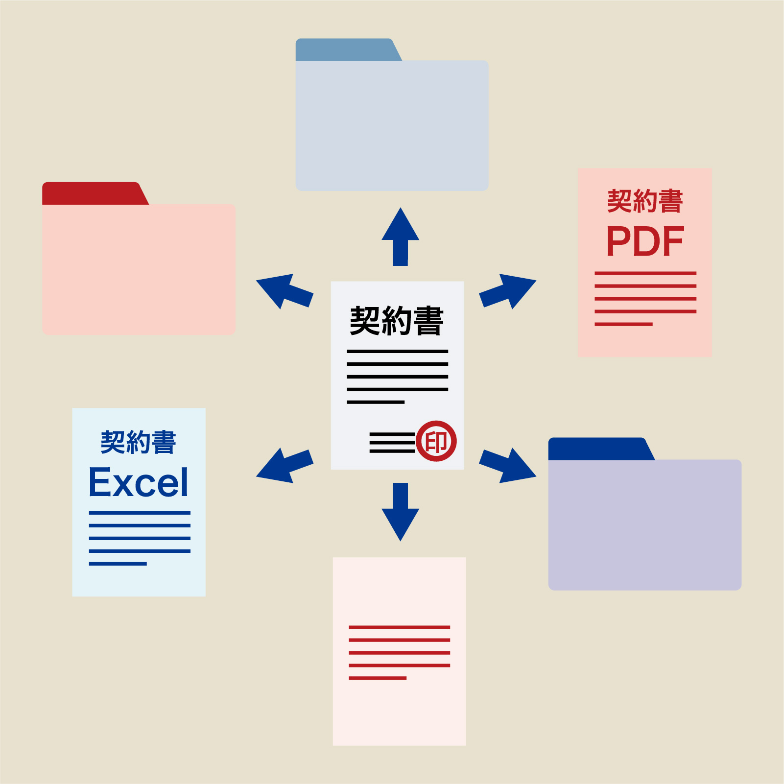 契約書の「原本」、「電子データ」、「台帳」を三位一体となり一括管理することができる専用システムです。