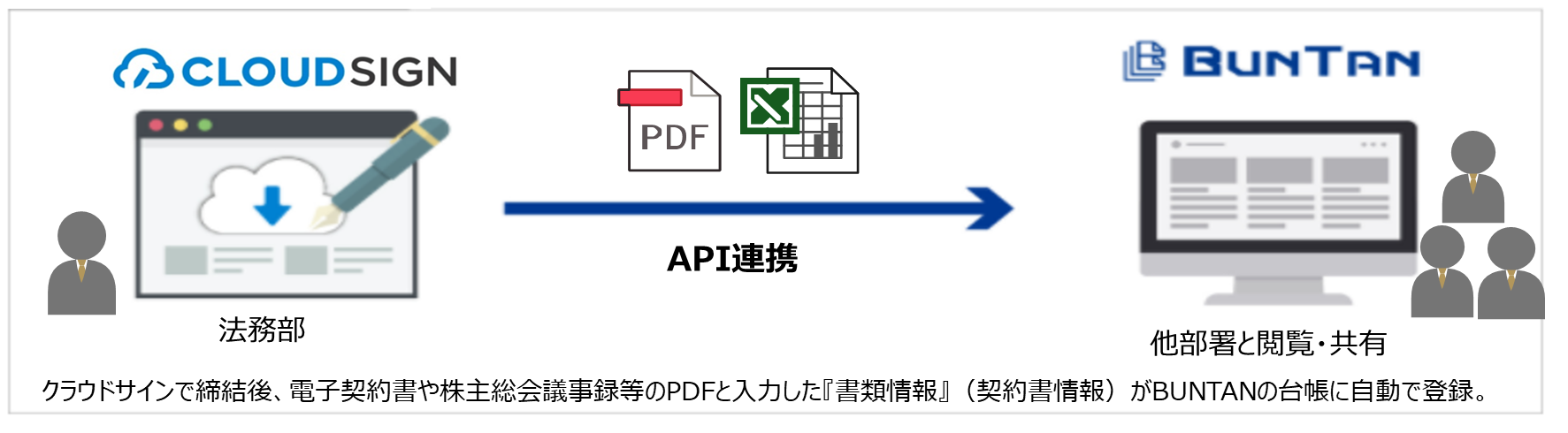 「クラウドサイン」で締結した後のPDFデータと書類情報データを自動連携で定期的にBUNTANにアップデートしていただいております。