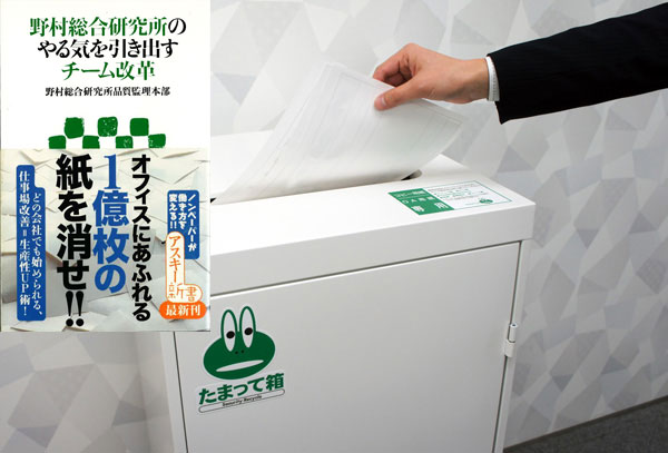 「かえる箱」とは、オフィスの重要文書を廃棄する際、低コストかつ機密を保持したまま収容・回収する箱のことで、正式名称は「たまって箱」といいます。NRI様では、「たまって箱」に貼られているカエルのイラストから、「かえる箱」の愛称で呼ばれています。