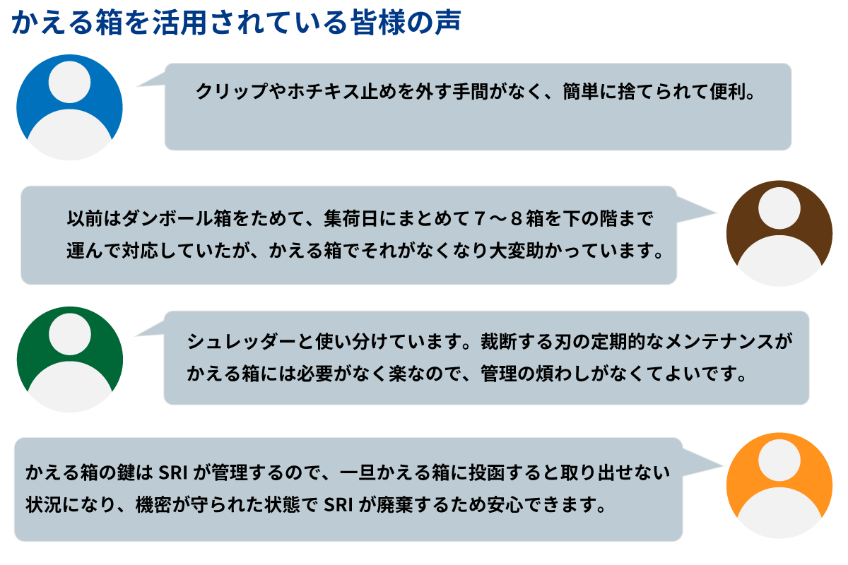 「かえる箱」であれば、ホチキス止めされた文書でもそのまま投函して捨てることが可能です。さらに「かえる箱」に一度文書を投入するとユーザ側では取り出せない仕組みになっており、SRIが鍵を厳重に管理することで、セキュリティを確保しています。