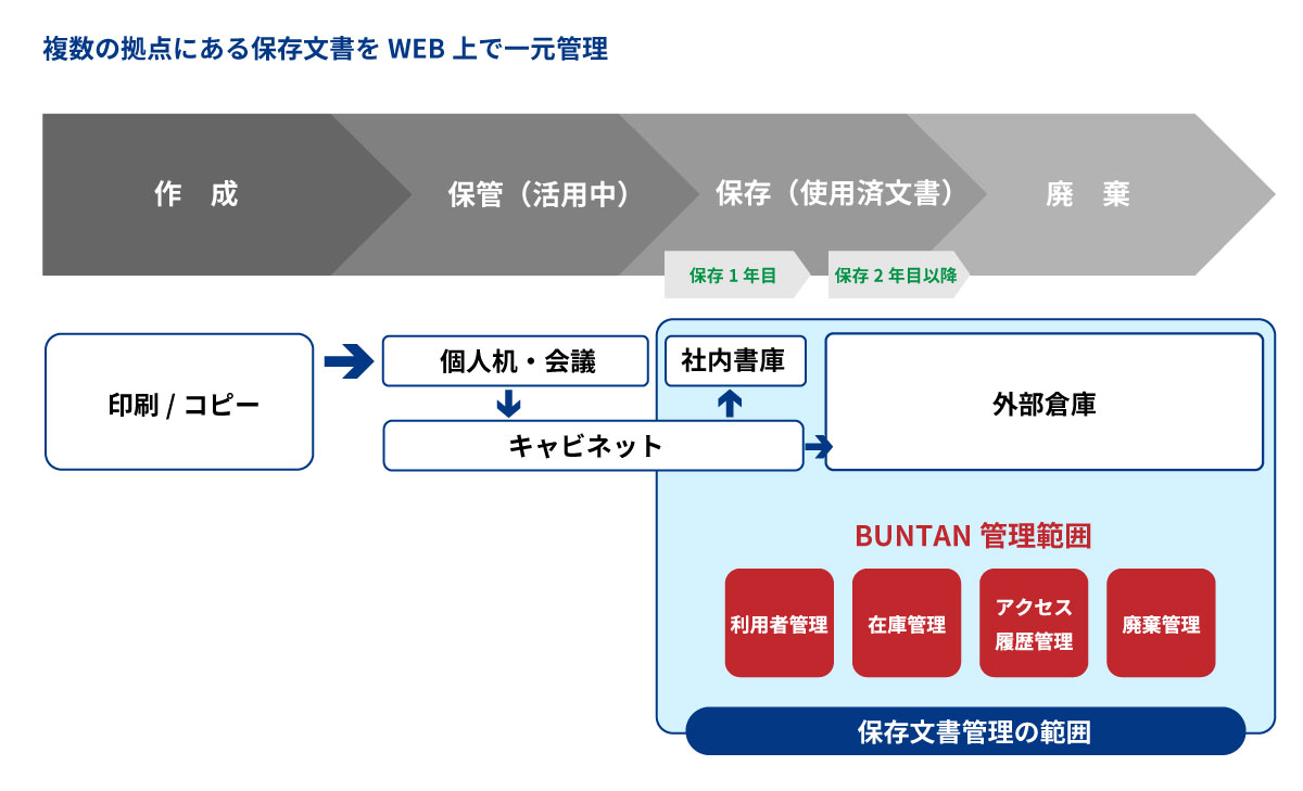 「BUNTAN」では、オフィスにある文書やSRI以外の外部倉庫の文書も一元的に管理しています。