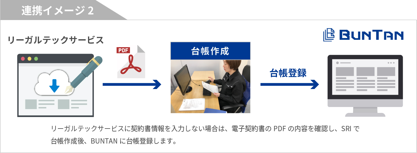 BUNTAN(ブンタン)は、リーガルテックサービスとAPI連携により、こうした課題を解決し、紙と電子の一元管理を実現します。