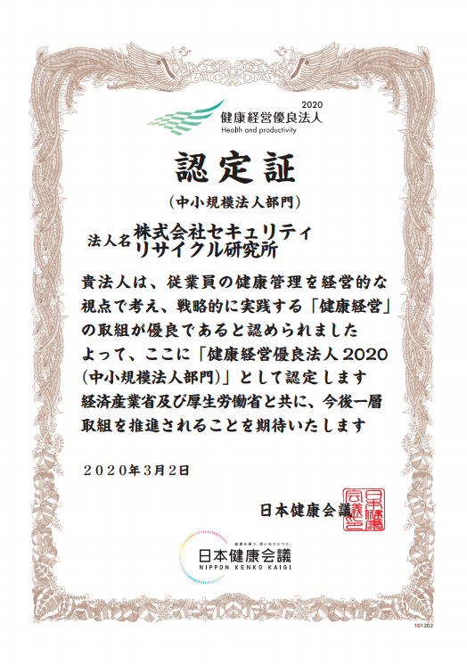 会社情報 2020.03.02 株式会社セキュリティリサイクル研究所(社長:北村 真)では、経済産業省と日本健康会議が共同で選定する「健康経営優良法人認定制度」において、3月2日(月)に「健康経営優良法人2020」(中小企業法人部門)に認定されました。