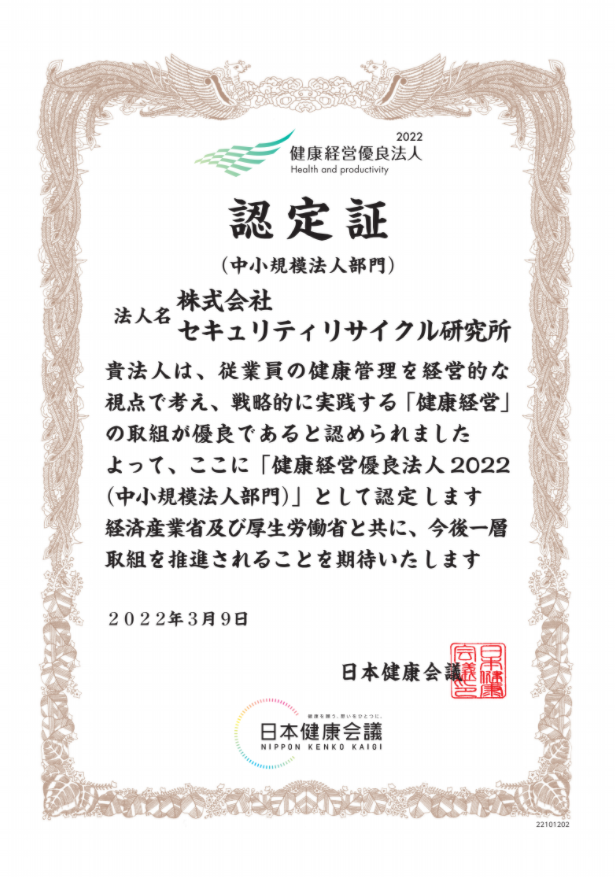 会社情報 2022.03.09 株式会社セキュリティリサイクル研究所(社長:北村 真)では、経済産業省と日本健康会議が共同で選定する「健康経営優良法人認定制度」において、3月9日(水)に「健康経営優良法人2022」(中小企業法人部門)に認定されました。