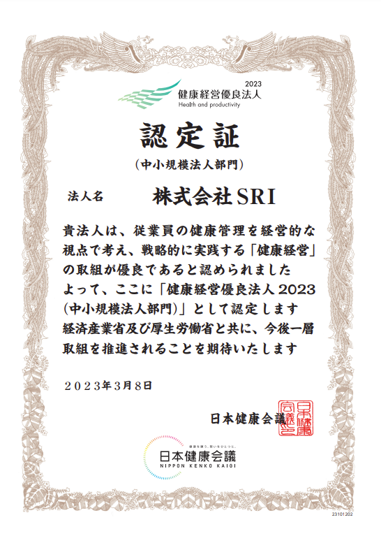 会社情報 2023.03.22 株式会社SRI(社長:北村 真)では、経済産業省と日本健康会議が共同で選定する「健康経営優良法人認定制度」において、3月8日(水)に「健康経営優良法人2023」(中小規模法人部門)に認定されました。