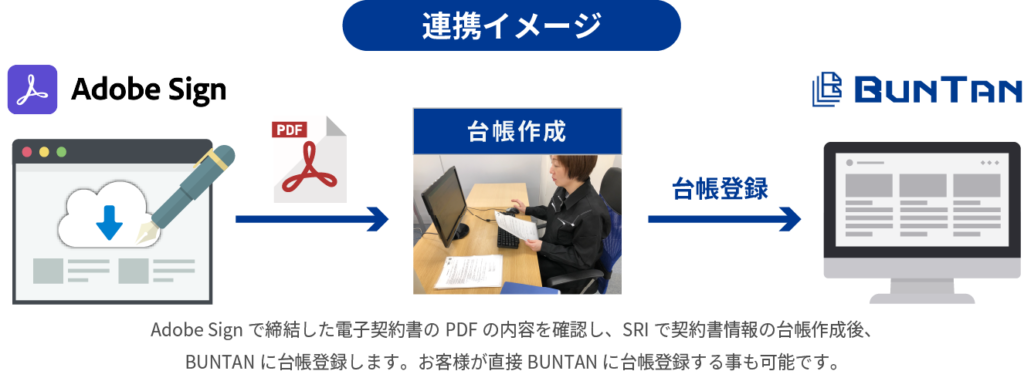 株式会社セキュリティリサイクル研究所(本社:東京都中央区、代表取締役社長:北村 真 以下SRI)とアドビ株式会社(本社:東京都品川区、代表取締役社長 神谷 知信 以下、アドビ)は、本日2021年10月15日(金)より、SRIが提供する契約書管理システム「BUNTAN」とアドビが提供する電子サイン「Adobe Sign」の連携サービスの提供を開始いたします。