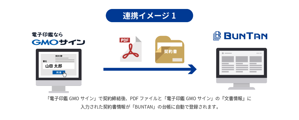これにより導入企業は、「電子印鑑GMOサイン」で契約締結が完了した電子文書と契約書情報を「BUNTAN」上にシームレスに同期し、紙の契約書もPDF化して「BUNTAN」上で管理することで、紙の契約と電子契約の一元管理が可能となります。